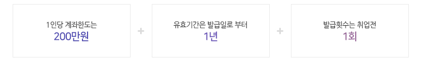 1인당 계좌한도는 200만원, 유효기간은 발급일로부터 1년, 발급횟수는 취업전 1회(원칙)