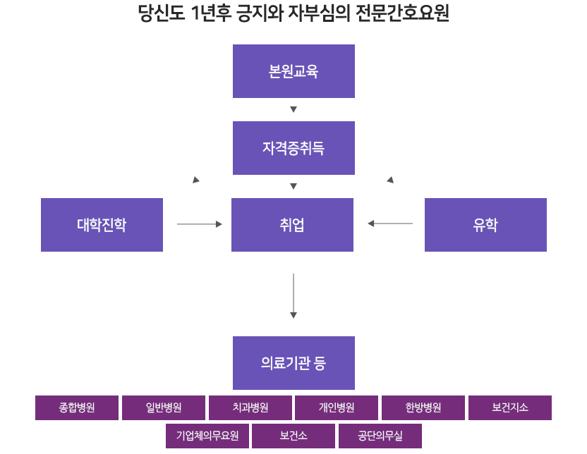 매년 수료생이 희망하는 의료기관 진료과에 100% 취업을 지원하고 있으며, 의료보험의 확대와 의료복지의 선진화로 병의원이 증가하고 이로 인하여 간호조무사의 자격소지가 절대 부족한 상황으로 본 학원은 실무 위주의 교육과 간호인의 소양교육을 병합한 철저한 교육으로 의료기관에서 추천받고자 하는 [최고의 간호 조무사를 양성하고 전원취업]을 지원하고 있습니다.